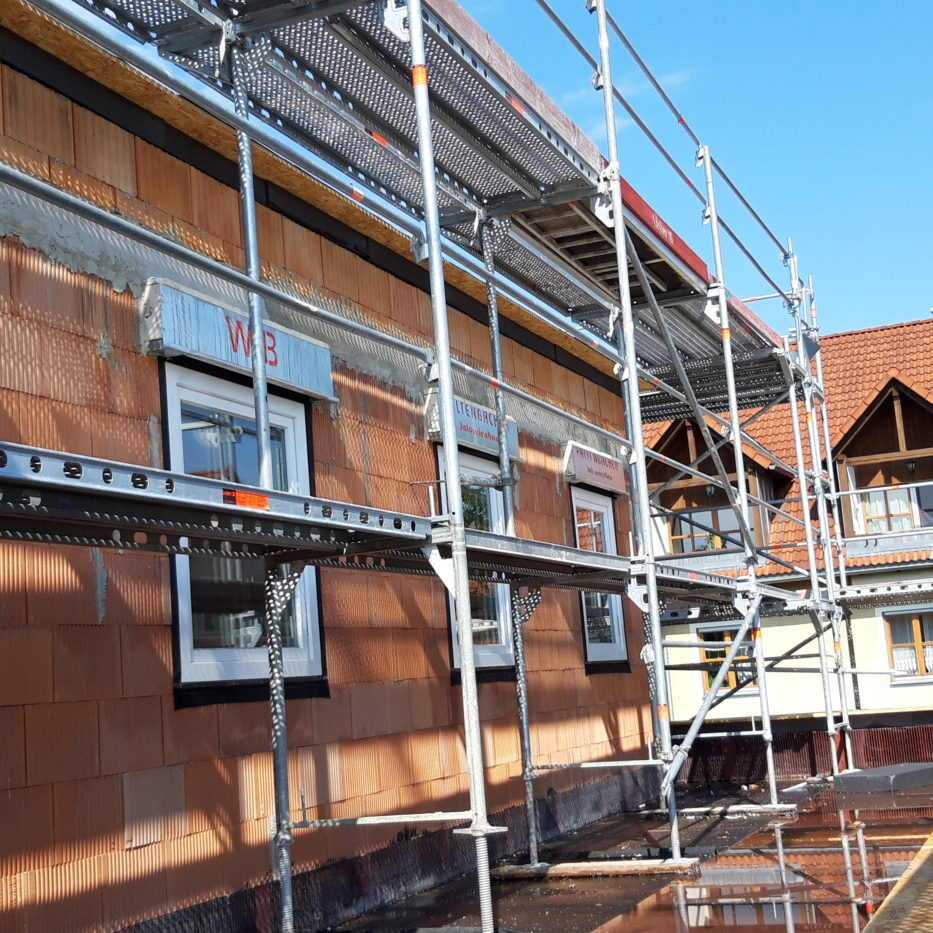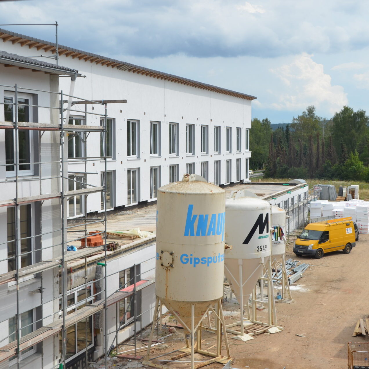 Ein mehrstöckiger Rohbau mit sichtbaren Ziegelwänden ist vollständig von einem Baugerüst umgeben. Im Hintergrund ist ein Kran zu sehen, der auf Bauarbeiten hinweist. Der Himmel ist klar und blau.